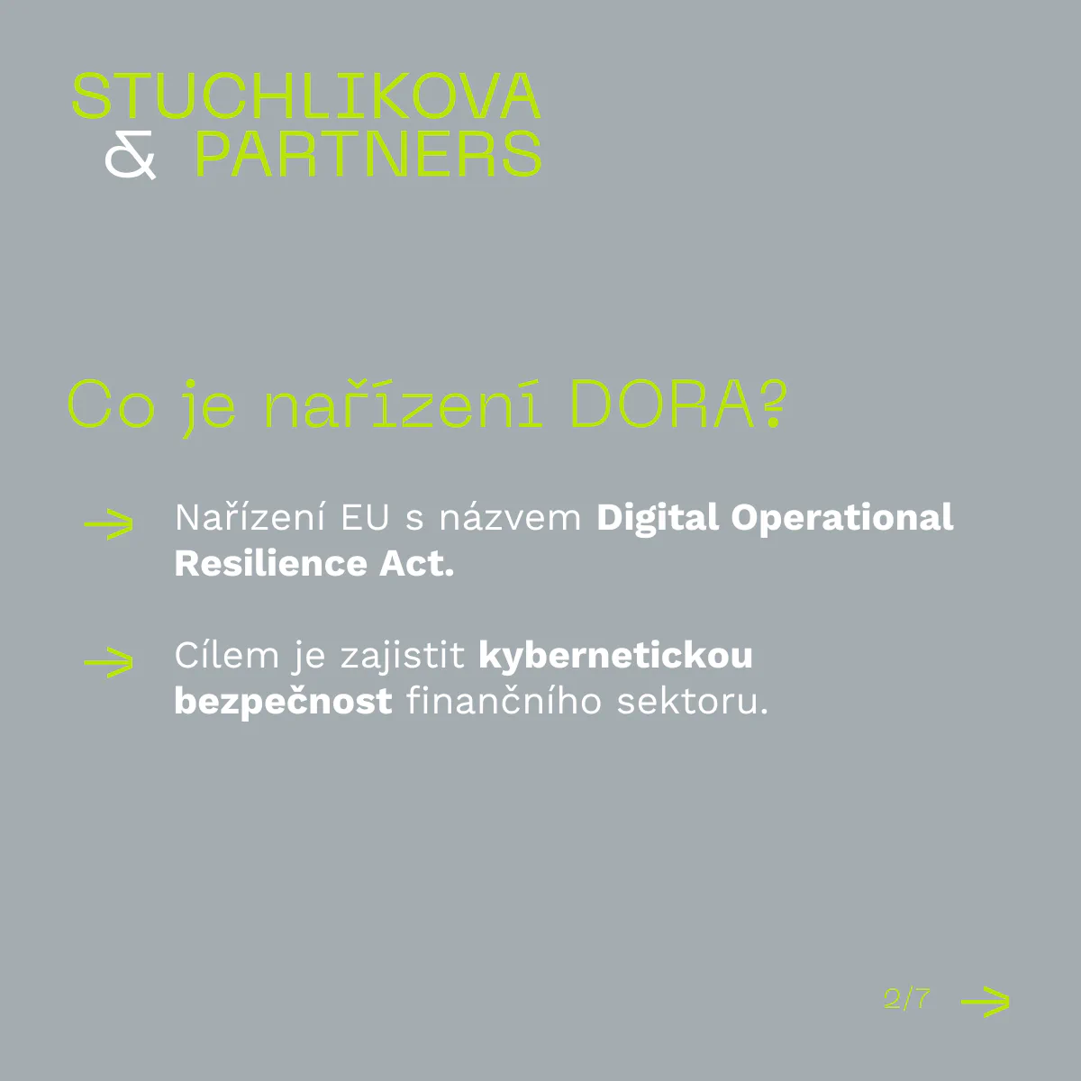 V lednu 2023 vstoupilo v platnost nařízení Evropské unie DORA (Digital Operational Resilience Act) s cílem posílit digitální odolnost a kybernetickou bezpečnost finančního sektoru. Nařízení stanovuje pro finanční subjekty řadu nových pravidel a povinností. Naše advokátní kancelář Stuchlíková & Partners Vám přináší jejich shrnutí v přehledné infografice.