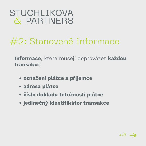 CASP i ICASP budou muset již brzy doprovázet každou transakci vybranými informacemi, zejména informacemi o plátci a příjemci. Výčet těchto informací a další novinky, které Travel Rule zavádí, Vám naše advokátní kancelář v přehledné infografice.
