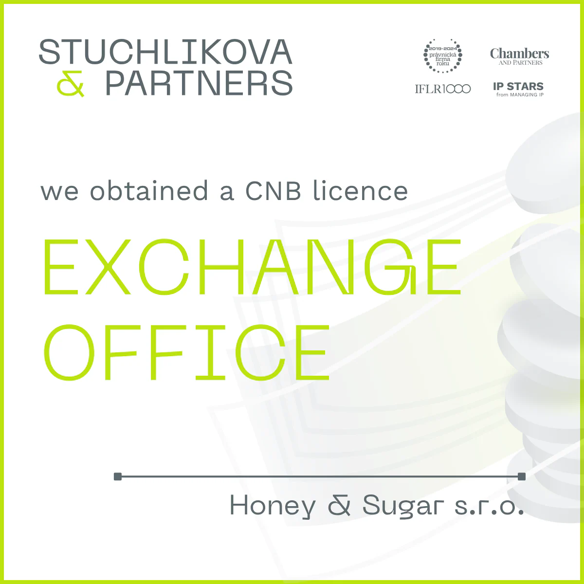 For our client, Honey & Sugar s.r.o., we obtained a Czech National Bank licence for the provision of currency exchange services.